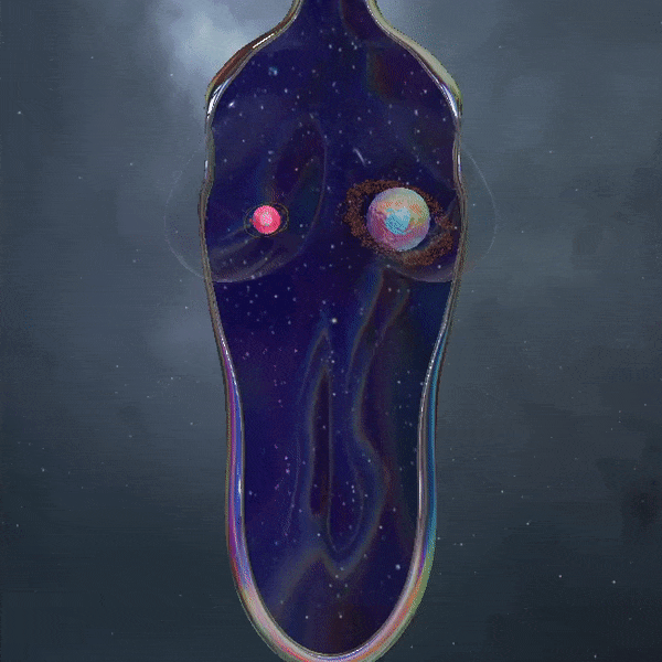 Space glass body with spinning planets and moons